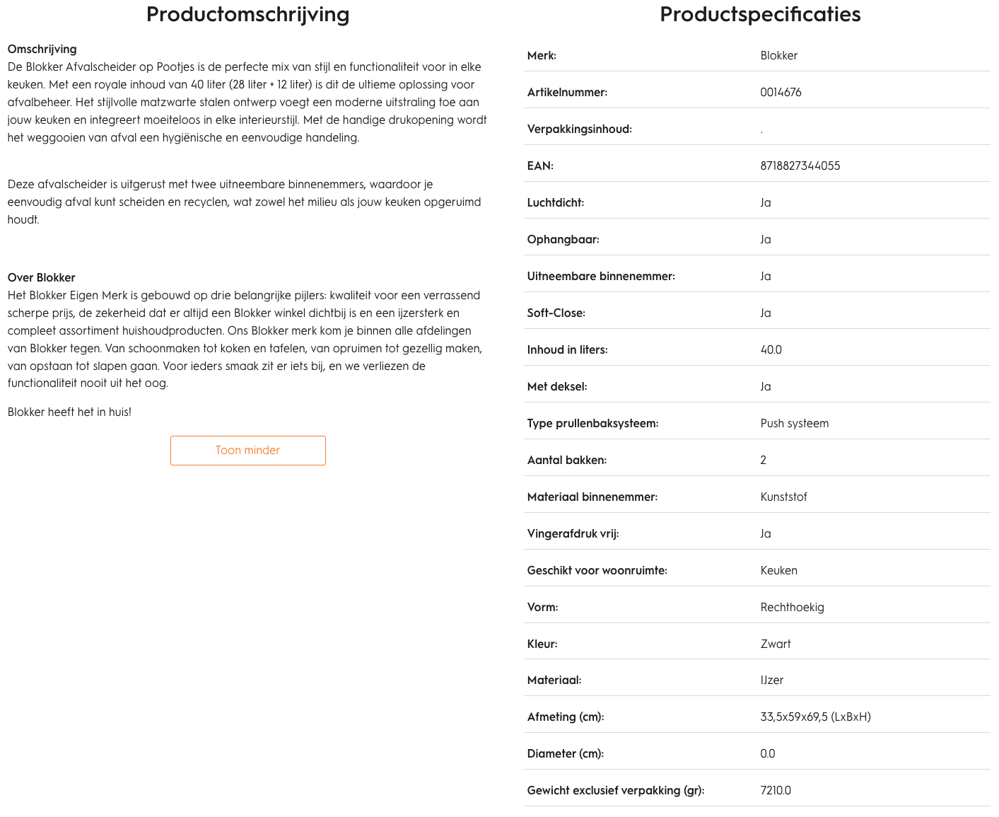 Der Blokker Abfalltrenner auf Beinen ist die perfekte Mischung aus Stil und Funktionalität für jede Küche. Mit einem großzügigen Fassungsvermögen von 40 Litern (28 Liter + 12 Liter) ist er die ultimative Lösung für das Abfallmanagement. Das elegante mattschwarze Stahldesign verleiht Ihrer Küche einen modernen Look und fügt sich mühelos in jeden Einrichtungsstil ein. Mit der praktischen Push-Öffnung wird das Entsorgen von Abfällen zu einem hygienischen und einfachen Vorgang.