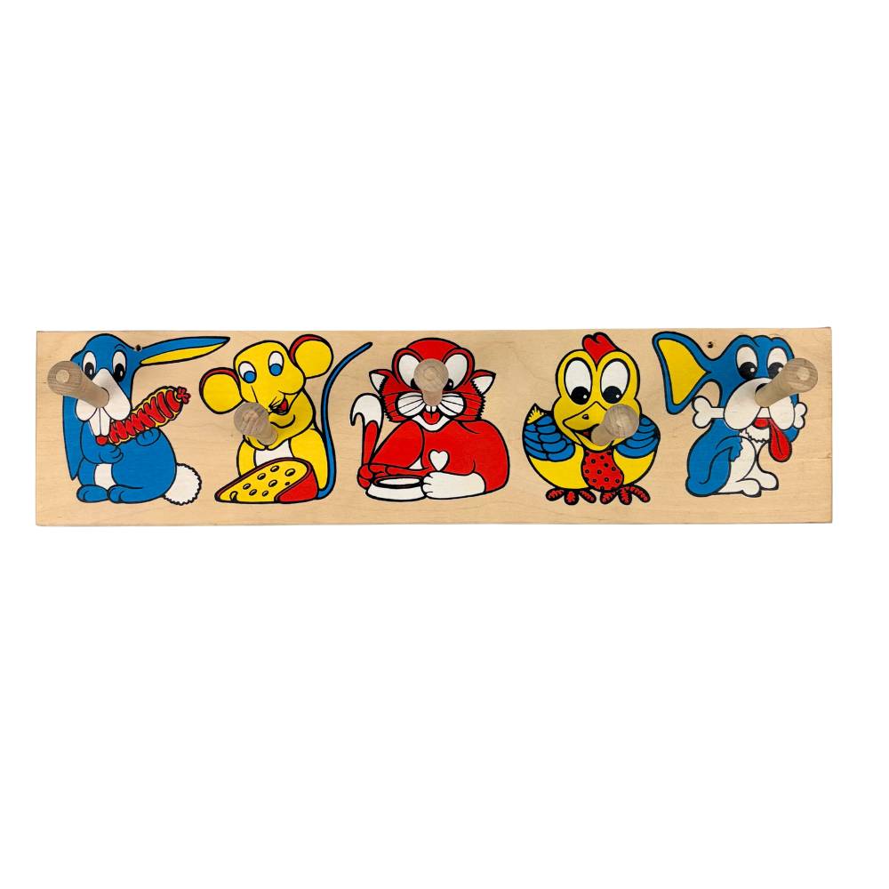 Bringen Sie Fröhlichkeit in das Baby- oder Kinderzimmer mit diesem bunten Holz Kindergarderobe. Diese Wandgarderobe ist nicht nur praktisch zum Aufhängen von Jacken, Taschen oder Bademänteln, sondern dient auch als schöne Wanddekoration. Die Garderobe ist mit fünf niedlichen, bunten Tierillustrationen verziert: ein Häschen mit einer Karotte, eine Maus mit Käse, ein Kätzchen, ein Vögelchen und ein fröhlicher Hund.