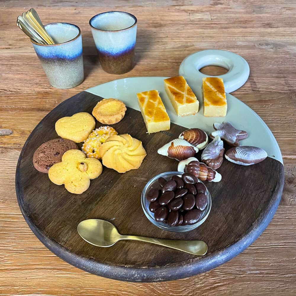 Entdecken Sie die perfekte Balance zwischen natürlichem Charme und modernem Stil mit unserem runden Servierbrett, das sich durch eine einzigartige Mischung aus Holz und einer dezenten Lackierung auszeichnet. Dieses Servierbrett kombiniert die Wärme von natürlichem Holz mit dem modernen Look von Lack und ist damit eine vielseitige und elegante Ergänzung für Ihre kulinarischen Präsentationen. Der hölzerne Teil verleiht ihm einen rustikalen Touch, während der lackierte Teil eine moderne Note hinzufügt. Dieses Servierbrett ist ideal zum Servieren von Vorspeisen, Käse oder Desserts. Es ist nicht nur funktional, sondern auch eine optisch ansprechende Ergänzung für Ihren gedeckten Tisch. Genießen Sie die perfekte Mischung aus natürlichen und modernen Elementen mit unserem runden Servierbrett.