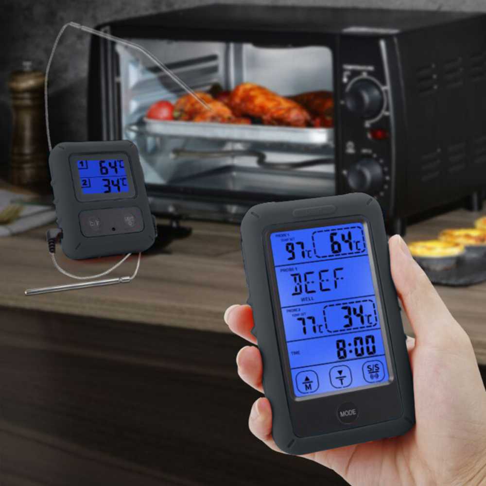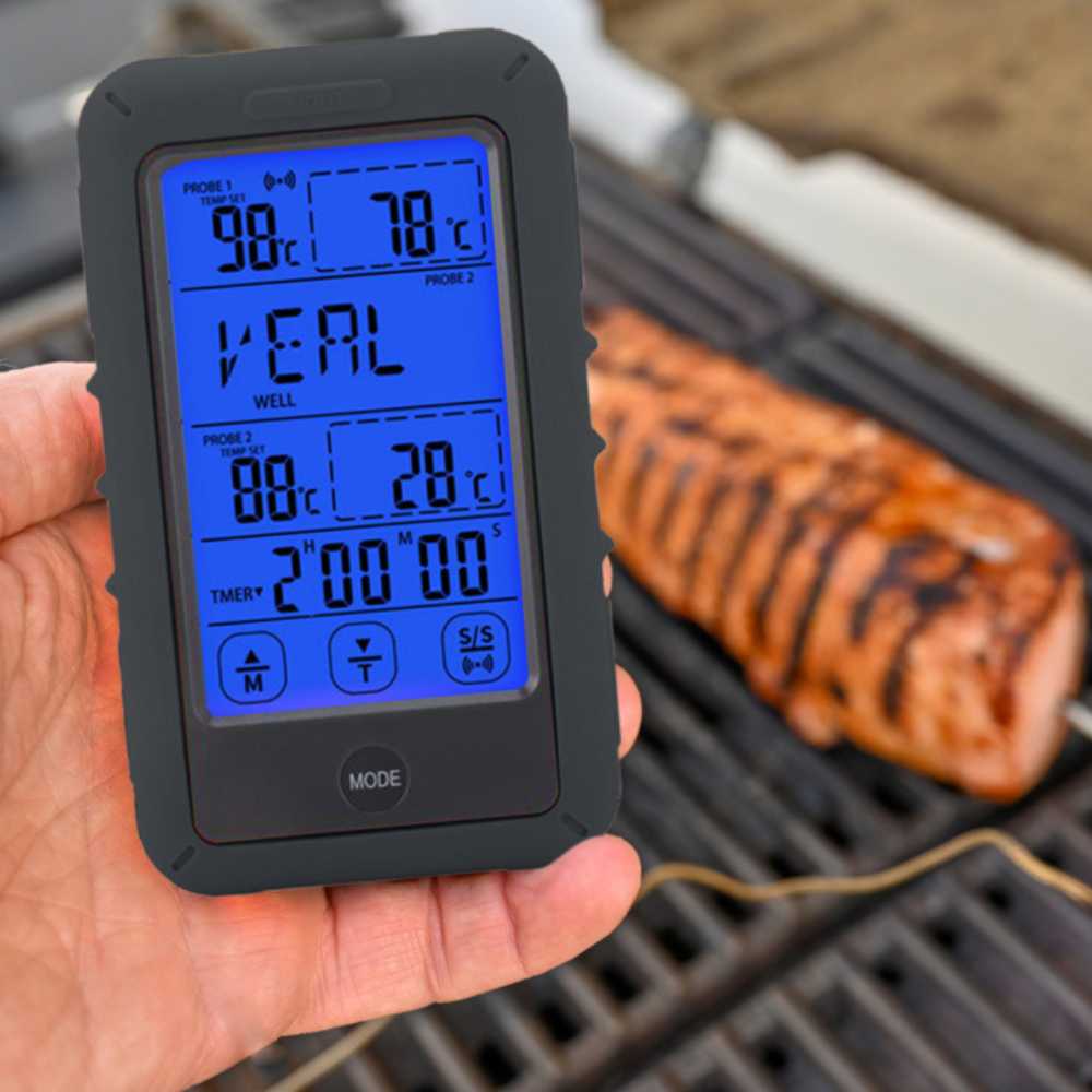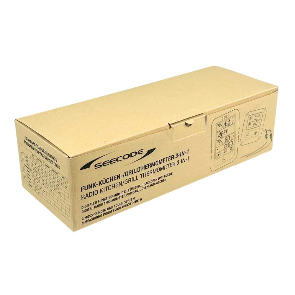Wählen Sie mit dem Sensorknopf: Rind, Lamm, Kalb, Hamburger, Schwein, Pute, Huhn oder Fisch. Stellen Sie die gewünschte Garstufe ein und stecken Sie das Thermometer in das Gericht. Kann bei Bedarf auch individuell programmiert werden. Während Sie sich mit Ihren Gästen unterhalten, überwacht das Thermometer den Garvorgang. Wenn Sie den Empfangsbereich verlassen, ertönt ein akustisches Warnsignal.