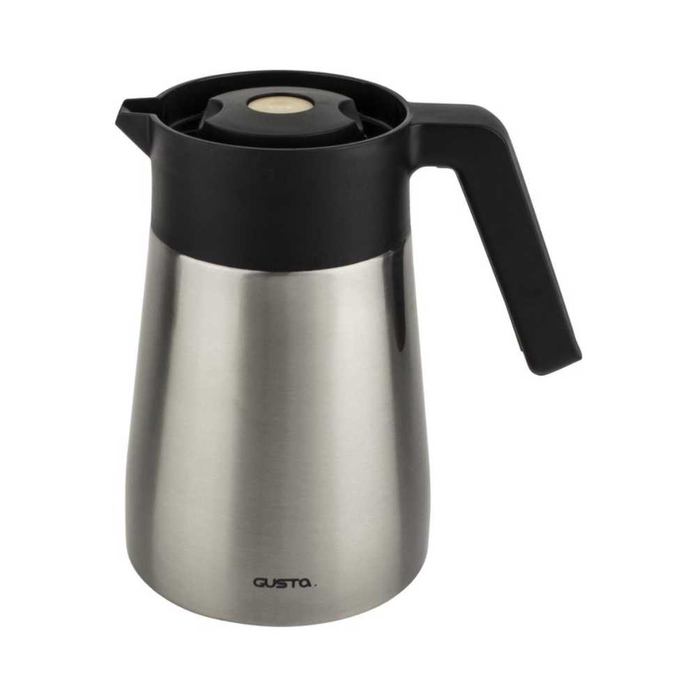 Graue Isolierkanne mit einem Fassungsvermögen von 1 Liter. Hält Getränke heiß oder kalt und ist für den täglichen Gebrauch zu Hause oder im Büro geeignet.