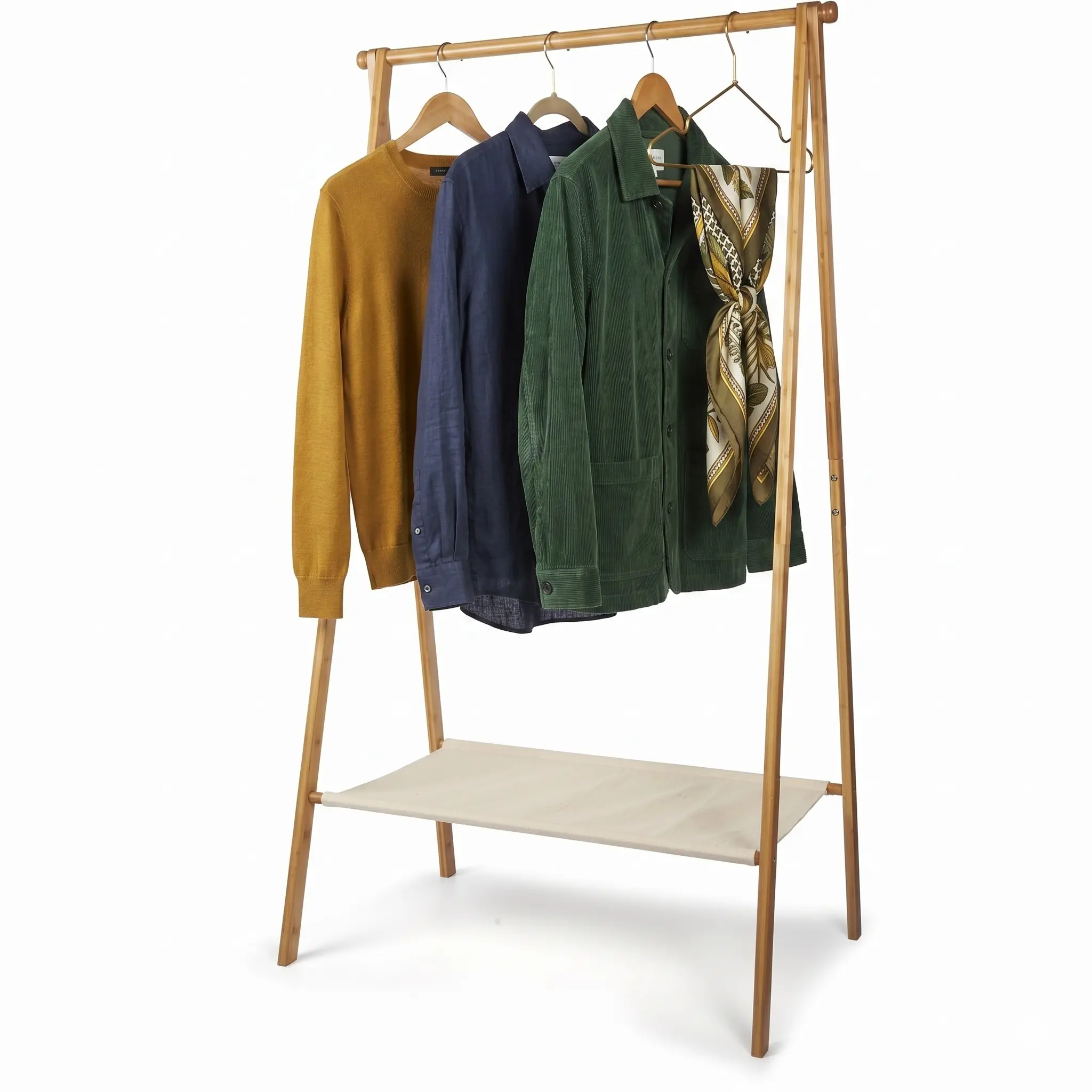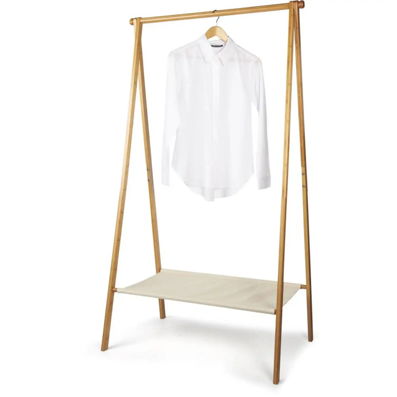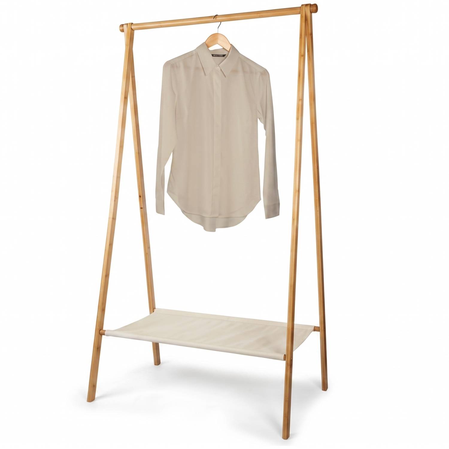 In addition to the hanging space for clothes, the rack features a convenient storage shelf at the bottom, made from a bamboo-cotton blend. The garment rack contains no harmful substances, is waterproof, and very easy to maintain; a wipe with a soft, damp cloth is sufficient. The rack is easy to assemble, allowing you to hang your clothing collection in an organised manner in no time at all.