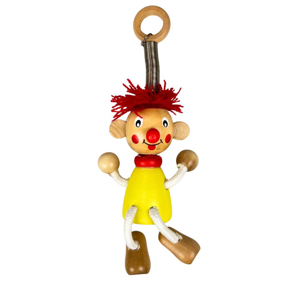 Bring cheer to the baby or child's room with this classic wooden clown on a spring. Thanks to the pull spring, the clown happily dances and bobs up and down as soon as you touch it. With its bright red hair and sunny yellow body, it's a colourful eye-catcher that will make any child smile.