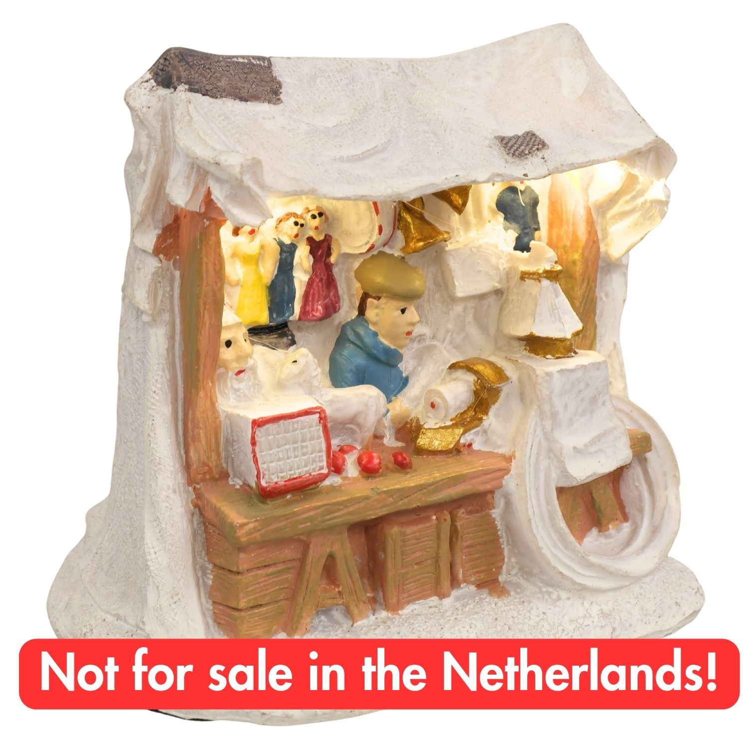 The stall is equipped with LED lighting and provides a cosy atmosphere. With its compact size of 11 x 7.5 x 10 cm it is a perfect addition to any Christmas village or decoration. The lights run on 2 AA batteries (not included) or via an adapter (not included).