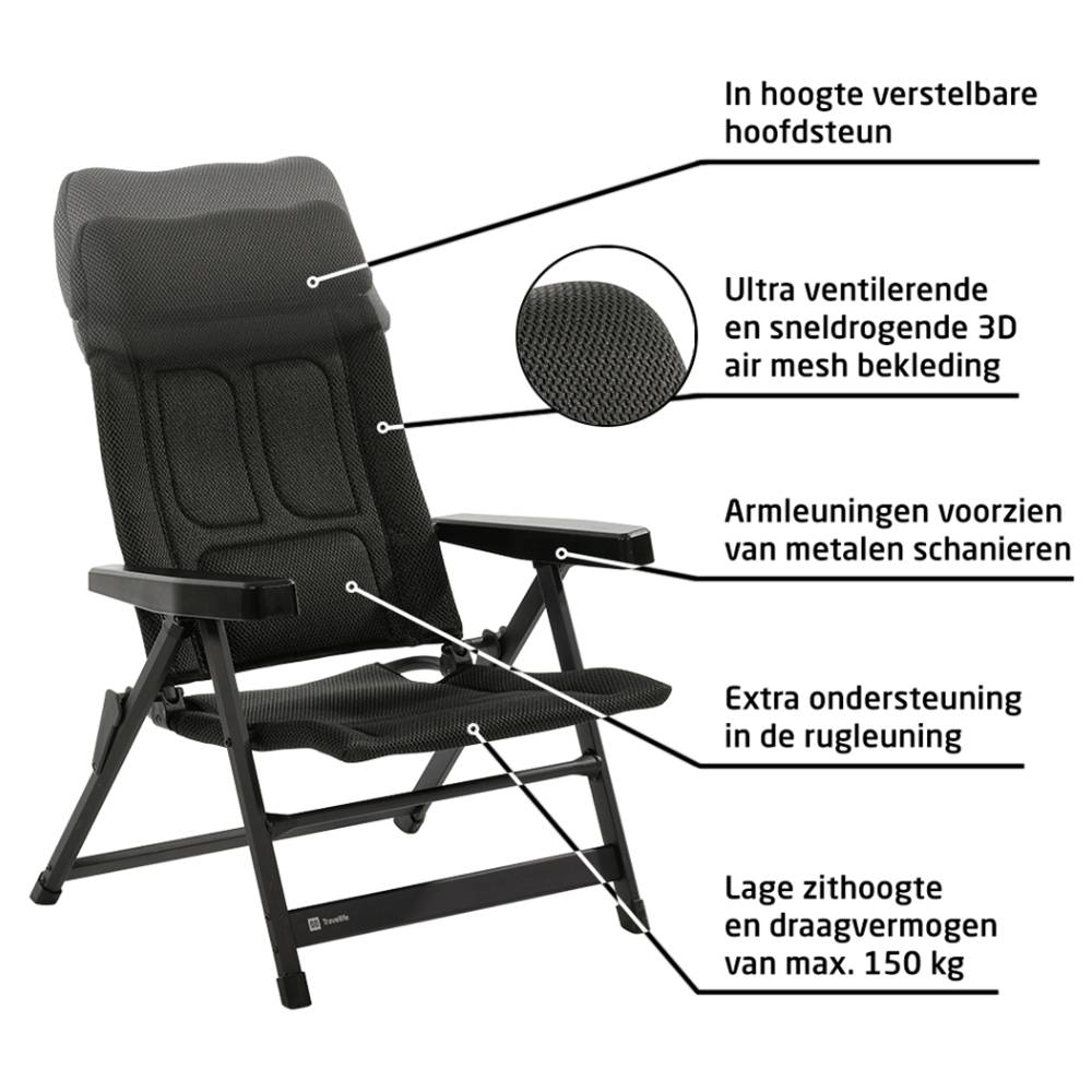 De stoel is bekleed met innovatieve 3D air mesh, voorzien van een zachte foamvulling. Dit materiaal is niet alleen heerlijk comfortabel, maar ook ultra-ventilerend en sneldrogend, wat ideaal is tijdens warme zomerdagen of een onverwachte regenbui. De rugleuning is ergonomisch gevormd en beschikt over een geïntegreerde lendensteun en een verstelbare hoofdsteun. Dankzij de vijf verschillende standen verstel je de stoel in een handomdraai van een actieve zithouding naar een heerlijke ligstand om te zonnen.